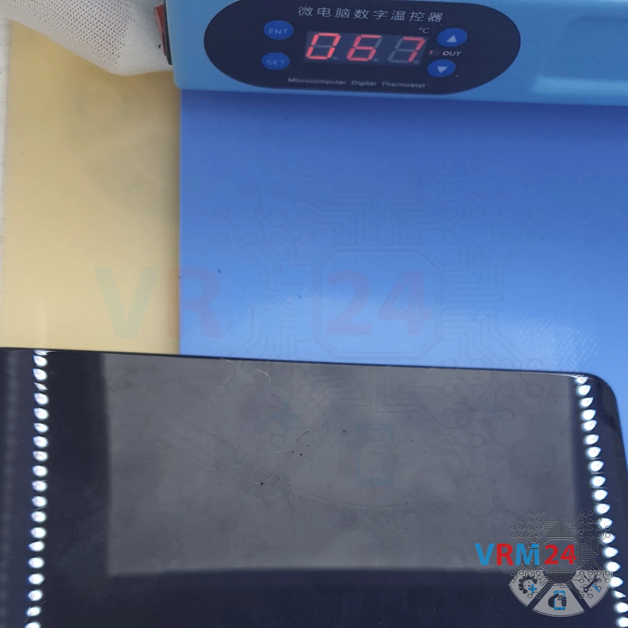 Next, we need to heat up the back cover. We’re using a heating pad for this, but you can also use a heat gun or hair dryer. Heat it to about 70°C, which is around 160°F. Keep the heat on for about 10 minutes.